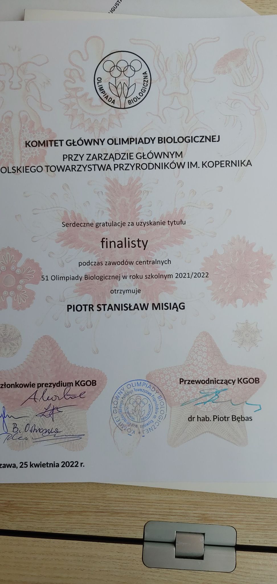 Dzisiaj w Warszawie zakończył się finał centralny 51 Olimpiady Biologicznej. Jesteśmy ogromnie dumni z osiągnięcia tytułu finalisty przez Piotra Misiąga ucznia kl. 3b. Ta bardzo trudna olimpiada na etapie centralnym składała się z trzech części: praktycznej w pracowniach botanicznej, zoologicznej, biochemicznej i bioinfomatycznej, ponadto uczniowie przystąpili do egzaminu pisemnego oraz bronili pracy badawczej, ocenianej przez dwóch, niezależnych recenzentów. Dzięki uzyskanemu tytułowi Piotr jest zwolniony z egzaminu maturalnego z biologii i uzyskuje najwyższy 100 % wynik. Piotrku życzymy dalszego spełniania naukowych marzeń.