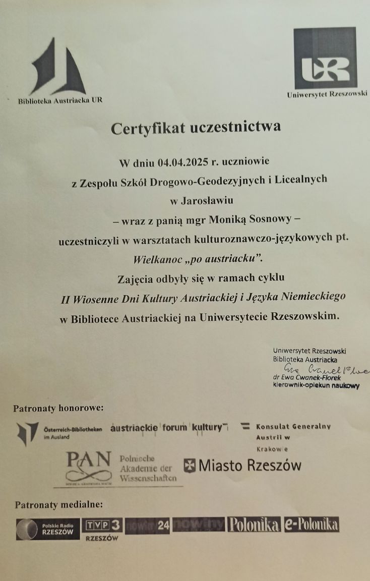 W dniu 04.04.2025 grupa uczniów z klasy 3H uczestniczyła w warsztatach kulturoznawczo – językowych pt. Wielkanoc „po austriacku”. Zajęcia odbyły się w ramach II Wiosennych Dni Kultury Austriackiej i Języka Niemieckiego w Bibliotece Austriackiej na Uniwersytecie Rzeszowskim. Zajęcia przeprowadziła dr Ewa Cwanek-Florek. Podczas warsztatów uczniowie obejrzeli prezentację multimedialną i wysłuchali wiele informacji i ciekawostek o zwyczajach wielkanocnych w różnych regionach Austrii. Zajęcia przyczyniły się również do wzbogacenia słownictwa z języka niemieckiego i ogólnej wiedzy o Austrii. Podsumowaniem warsztatów był konkurs z nagrodami. Warsztaty były dla uczniów ciekawą lekcją języka i wiedzy o Austrii. Opiekunem uczniów była pani Monika Sosnowy.
